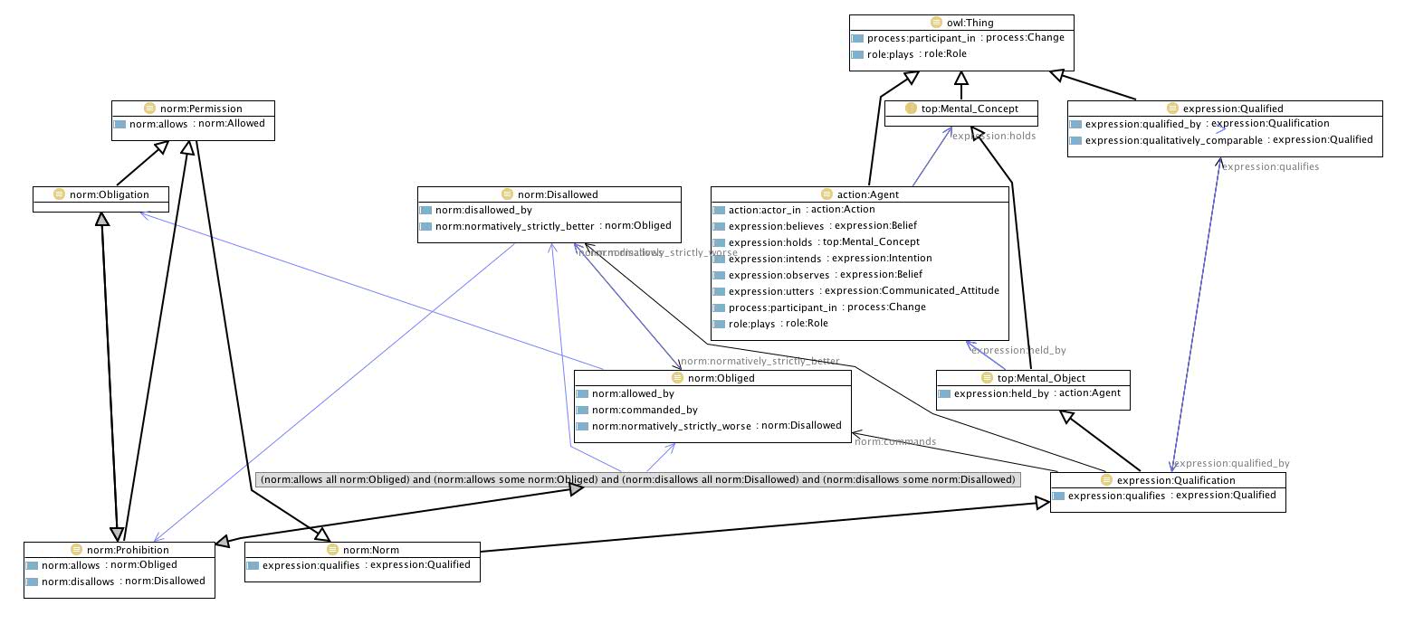 Prohibition obliges/allows thing(s), to which therefore the predication Obliged applies, and disallows thing(s), to which therefore the predication Disallowed applies. The union of the thing(s) allowed and the thing(s) disallowed is qualified by the prohibition. The things allowed and disallowed by the prohibition are disjoint (and completely partition the space of things qualified). If S then O(A) means that S is qualified, S and A is obliged/allowed, and S and not A is disallowed. If S then F(A) means that S is qualified, S and A is disallowed, and S and not A is obliged/allowed. The difference between Obligation and Prohibition is in which part of the partition of the qualified space is explicitly described by the normative statement. Alternative label: directive
